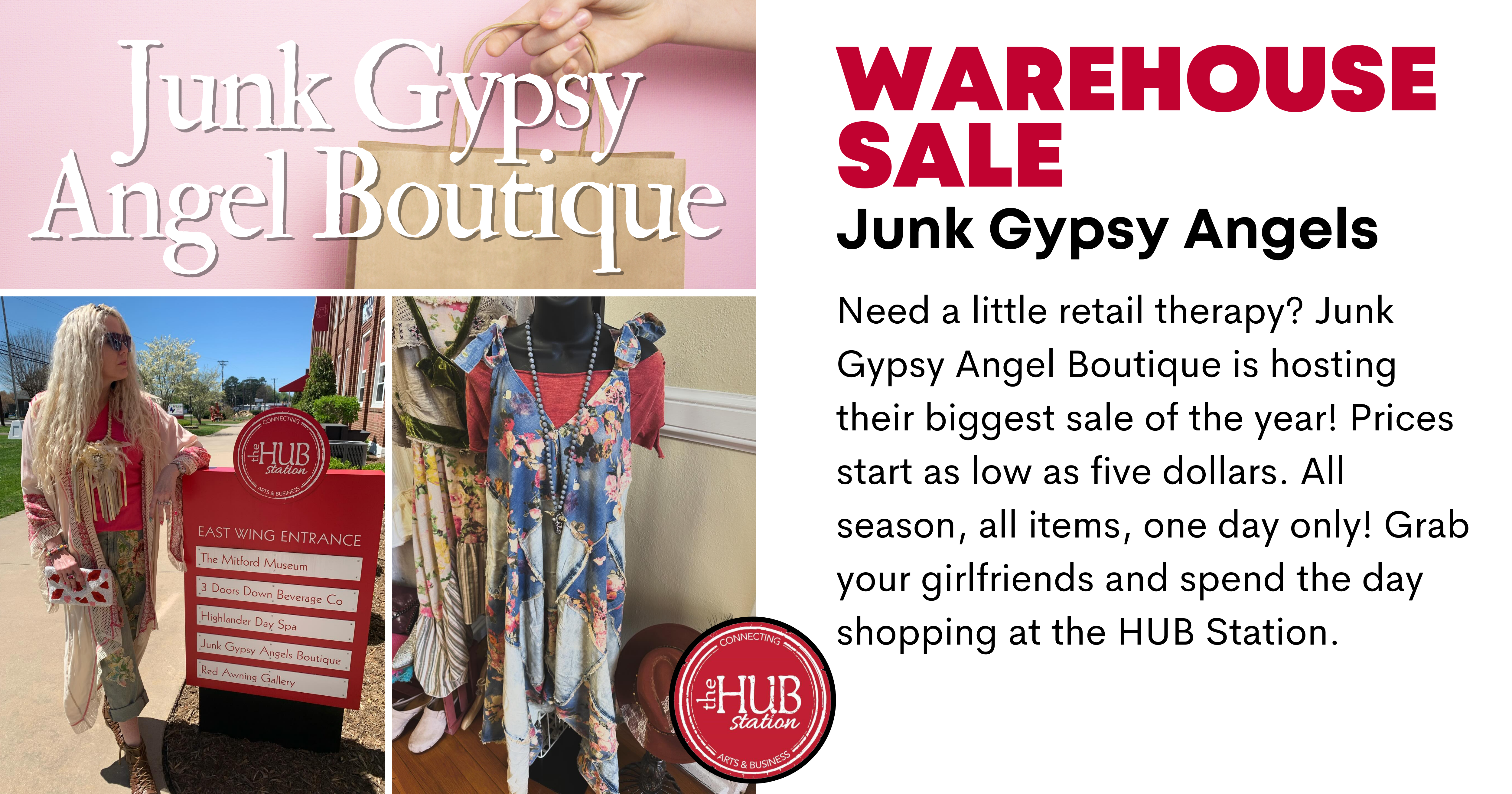 Join us for the highly anticipated Junk Gypsy Angels Warehouse Sale on August 10th from 9 AM to 3 PM at the HUB Station Arts Center in Hudson, NC. Discover a treasure trove of boutique fashion finds at unbeatable prices, with items ranging from just $5 to $25.