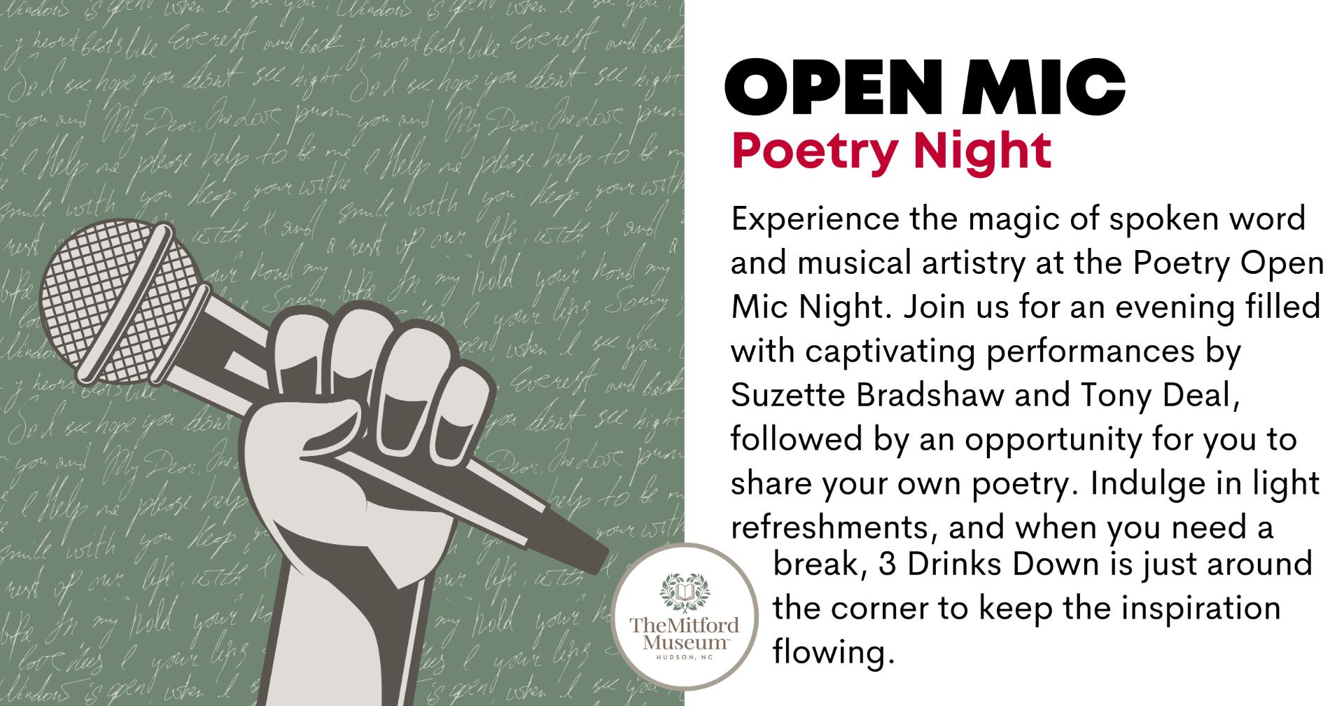 Mark your calendars, gather your verses, and prepare to be moved at the Poetry Open Mic Night hosted by Mitford Museum and The HUB Station. See you there!